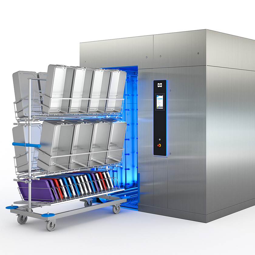 搬送カートやコンテナ、手術室用シューズ、プラスチック容器、受け皿、および膿盆などの大容量アイテムの処理に適した大型チャンバーウォッシャーディスインフェクター。