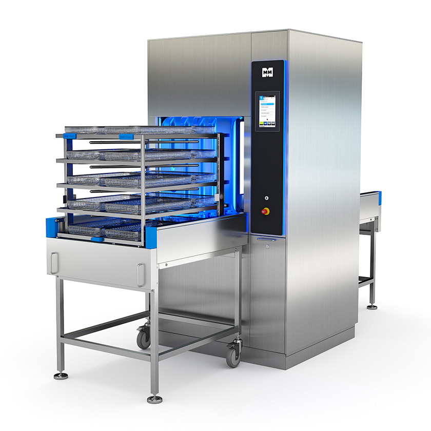 MMMが開発した4Dクリーニングシステムは、商品に対して均等なスプレーを上下から行える技術を提供します。これは、水の量とプロセス用の洗剤に調整された最適なポンプ圧力によって、チャンバー内の2つの回転アームと2つのJANUSラック接続など、4つの洗浄装置に均等に水を供給します。