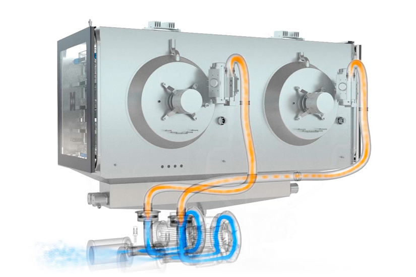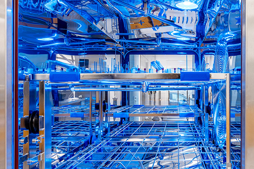 HEPAフィルターを通じて加温された空気が、上下の洗浄ブレードとチャンバー槽内より取り込まれます。側面に取り付けられたファンにより気流が発生し、すべてのラックに直接到達します。チャンバー内での高いレベルの熱循環により、既存の熱が蓄積され、乾燥プロセスが大幅に加速します。洗浄槽内に設置されたエアタービンは、洗浄と消毒が行われる仕組みとなっています。