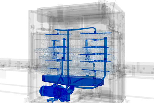 巧妙に計算された形状や構造、機械とラックの相互作用により、処理中の商品のすべての外部および内部、表面に最適にアクセスして湿潤化が行われます。