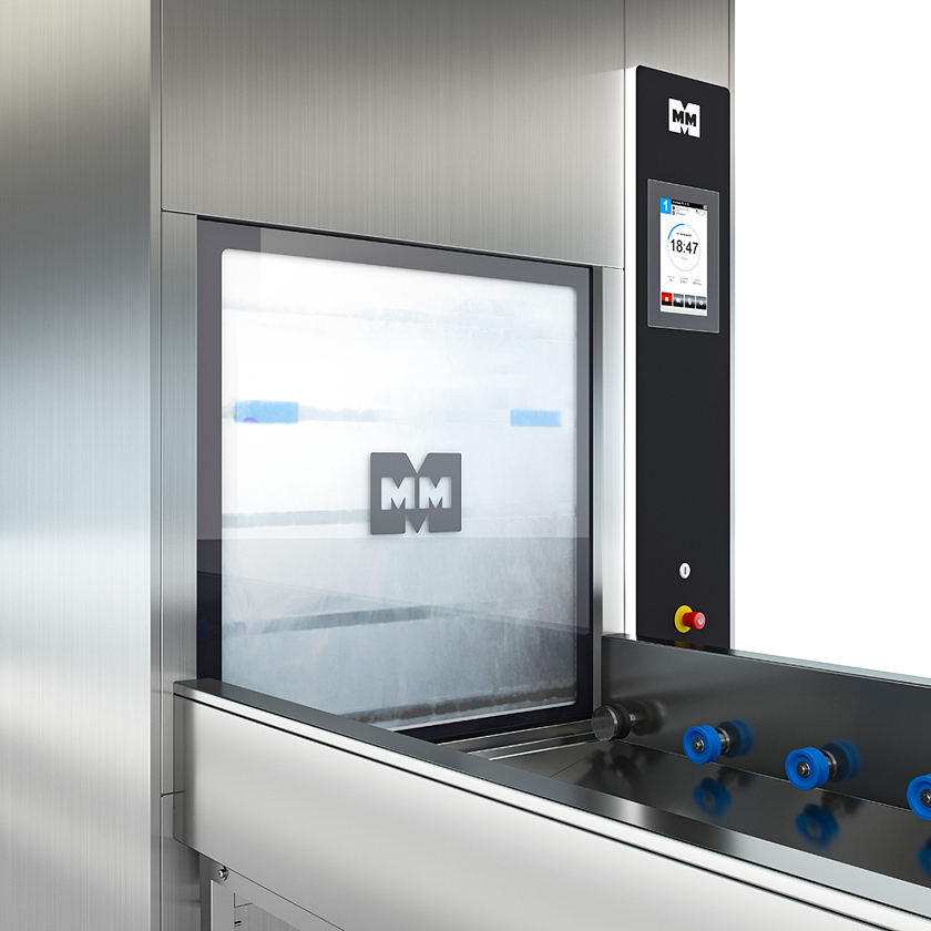 MMMが開発した8Dクリーニングシステムは、上下から全体をカバーするスプレーパターンを生成します。水量とプロセス用の洗剤に最適に調整されたポンプ圧力により、水はチャンバー内の2つの回転アームと2つのJANUSラック接続の4つのデバイスに均等に供給されます。